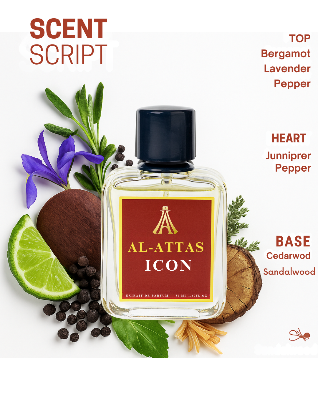 The scent opens with the crisp brightness of Bergamot and Neroli, sharpened by the subtle heat of Black Pepper and Petitgrain. At its heart, aromatic layers of Lavender, Cardamom, Juniper Berries, and Sage unfold smooth, refined, and undeniably masculine. Finally, the depth of Vetiver, Oakmoss, Iris, Leather, and Oud grounds the fragrance in earthy elegance and quiet power.